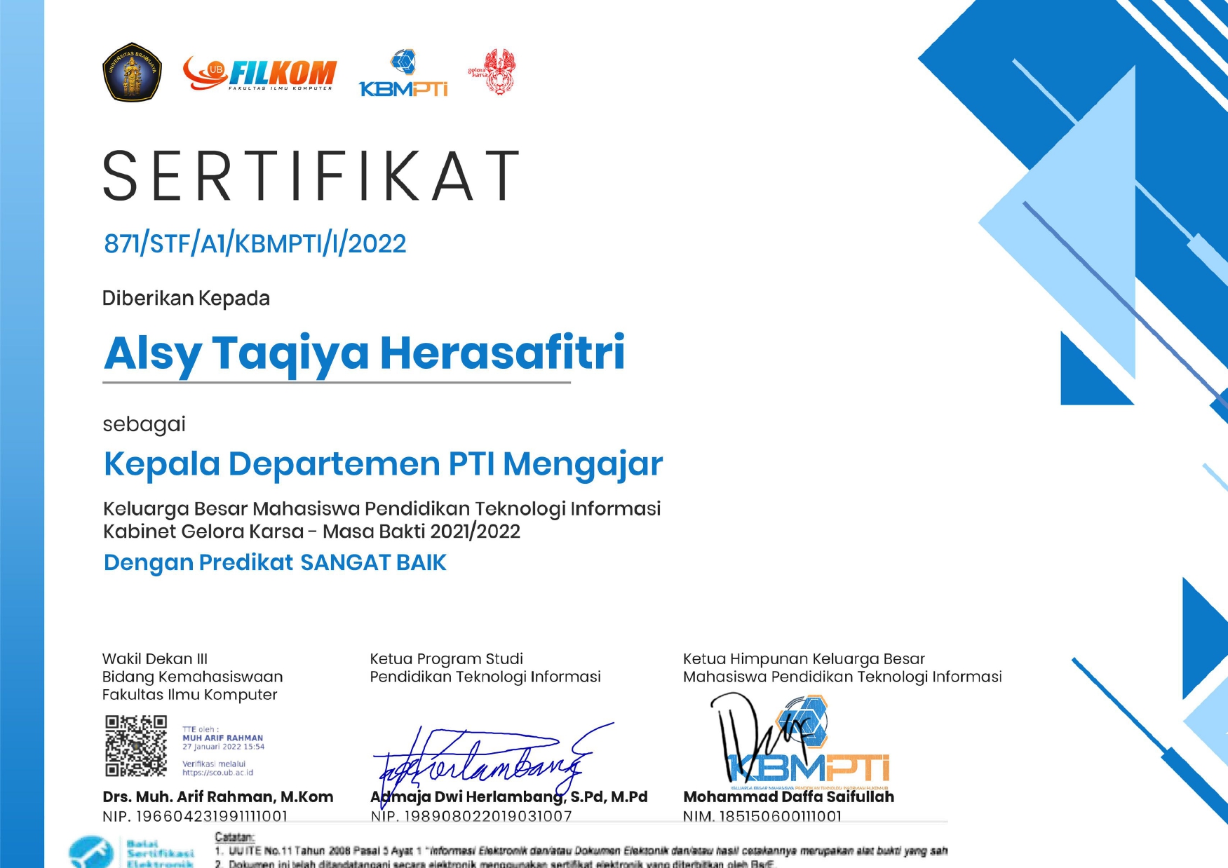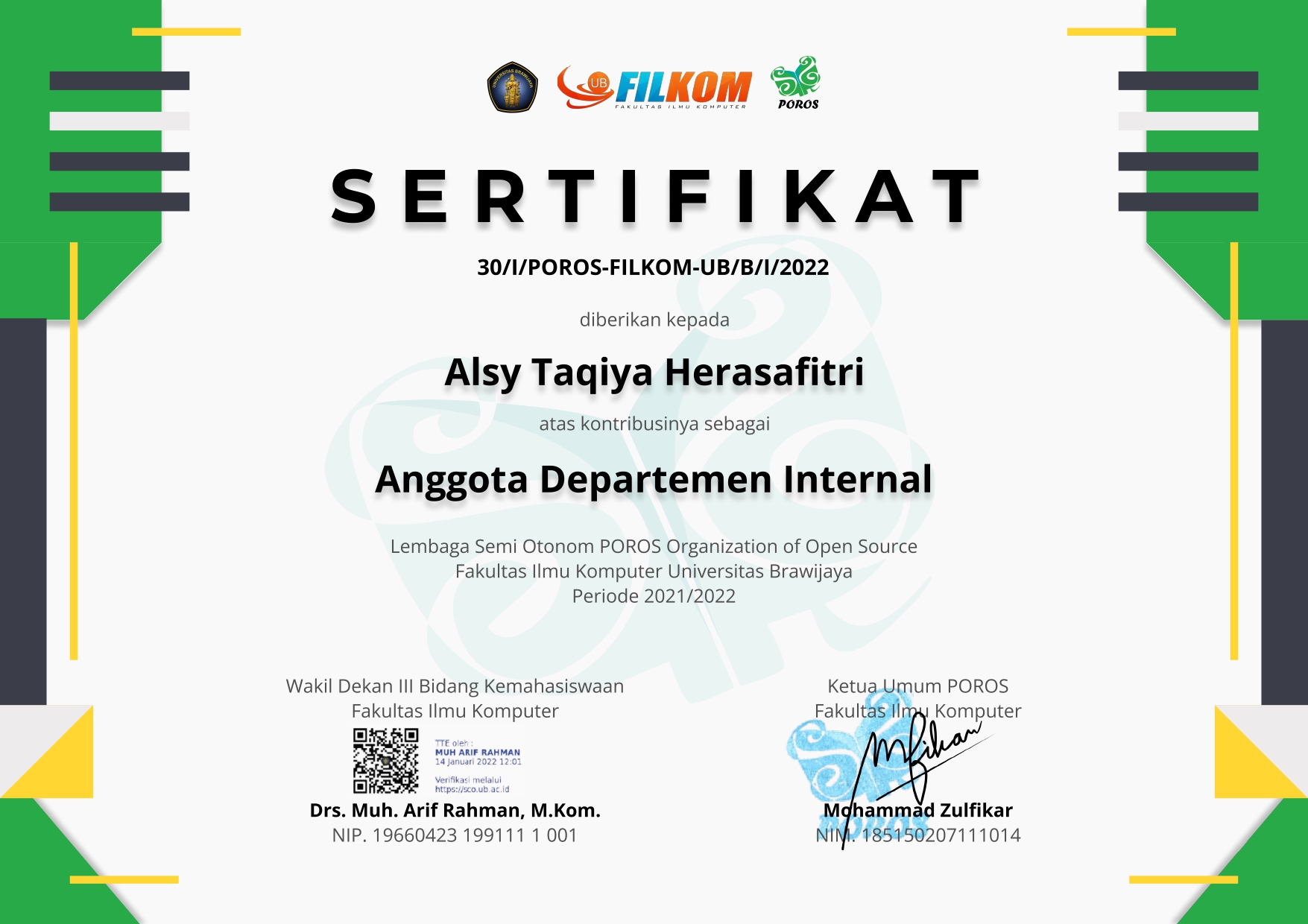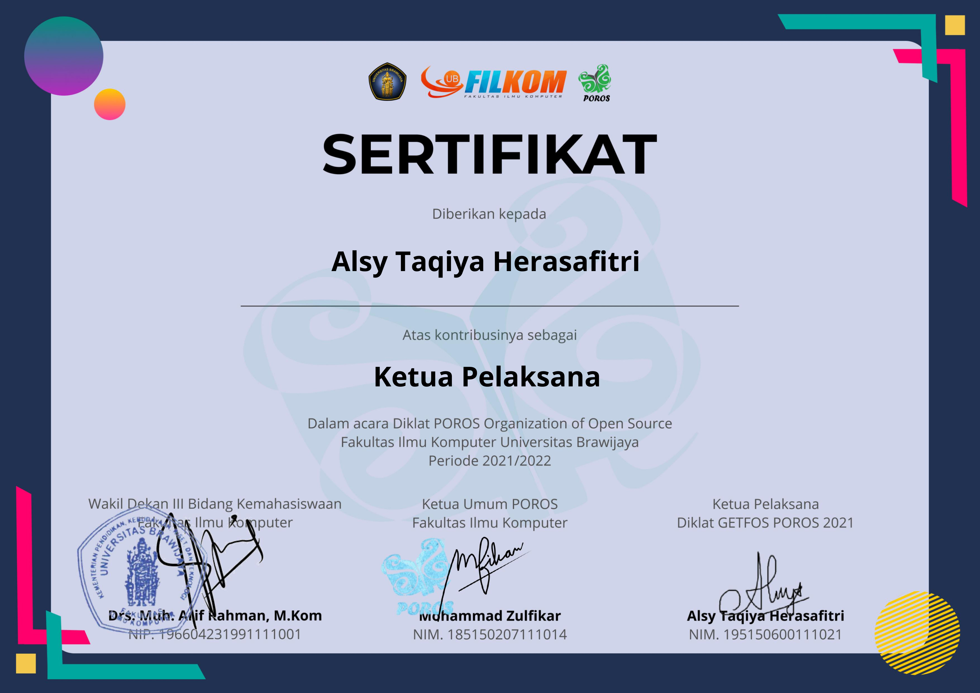 Member of the Internal Department of the POROS Organization of Open Source, Faculty of Computer Science, Brawijaya University, Period 2021/2022