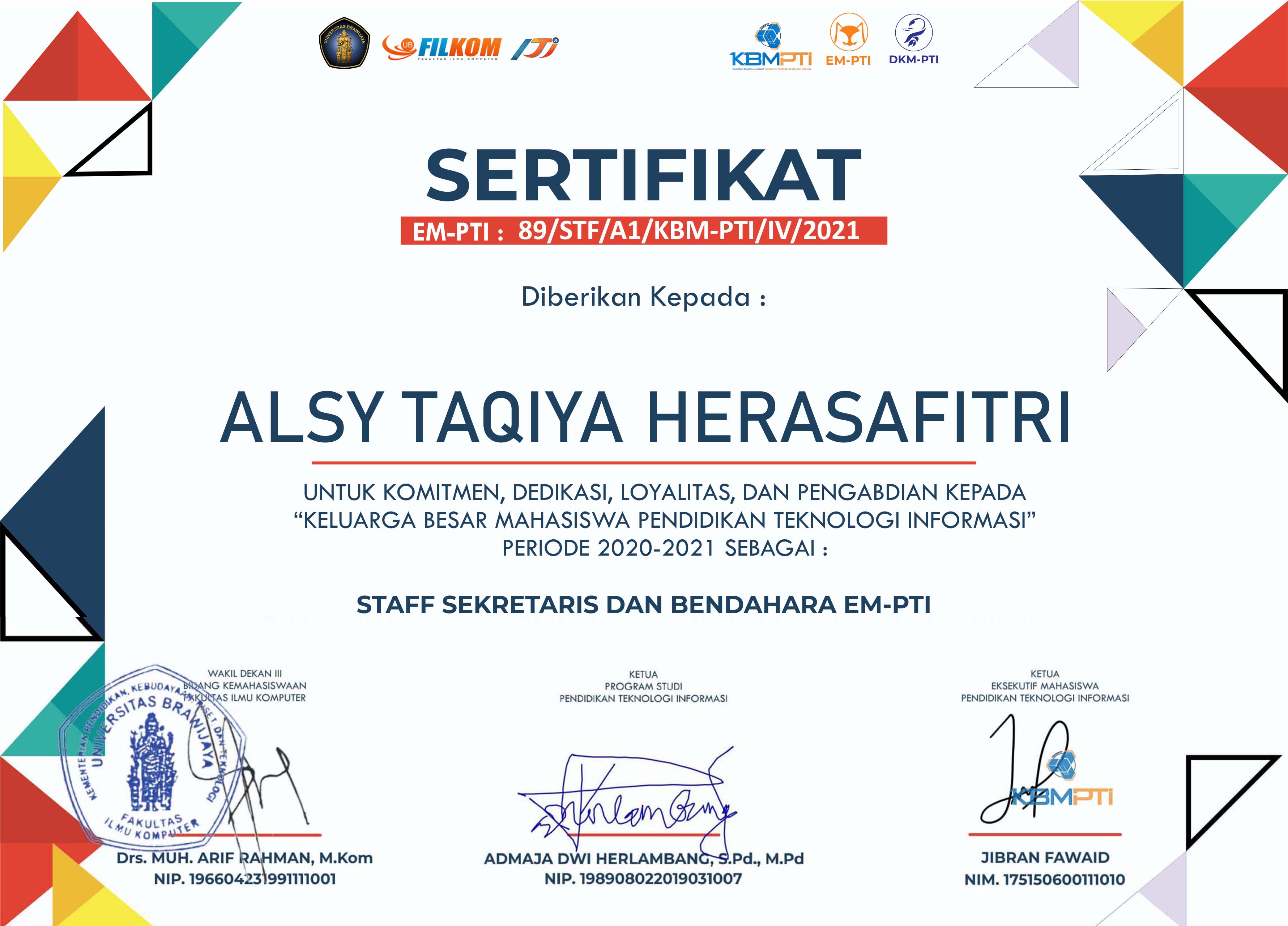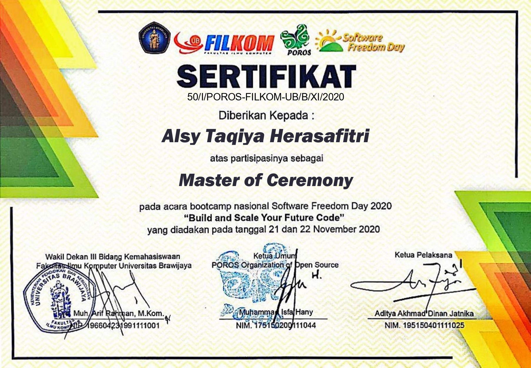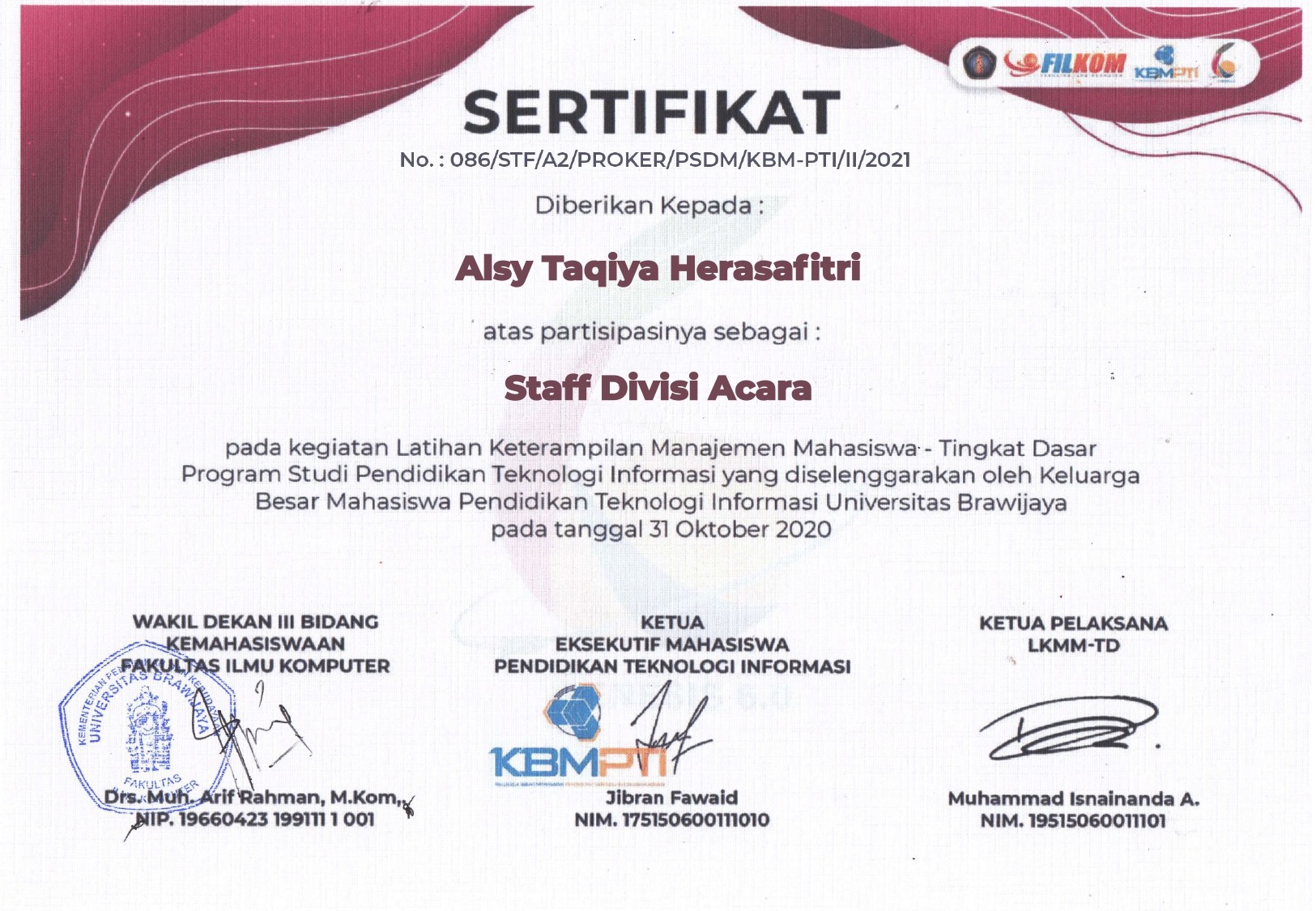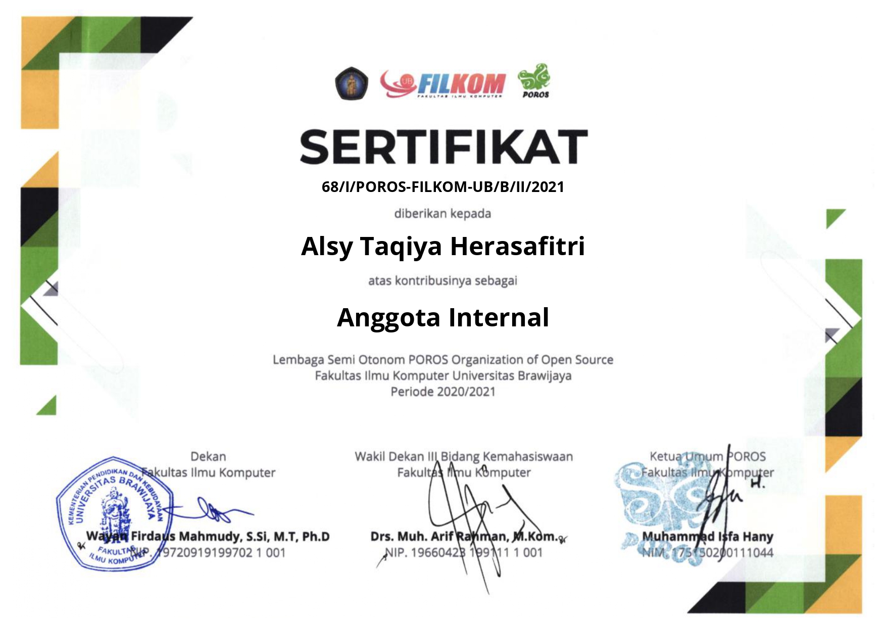 Member of the Internal Department of the POROS Organization of Open Source, Faculty of Computer Science, Brawijaya University, Period 2020/2021